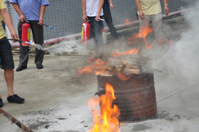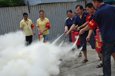 员工安全抵达厂外后领导开始讲解灭火器使用方法