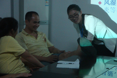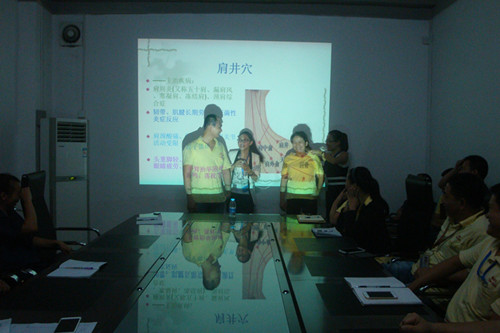 陈老师还现场向员工们传授了穴位保健相关基础知识和有效的预防及改善方法。通过真人模拟的方式,用电疗仪等辅助治疗器械帮助员工了解疏通穴位、测量血压的操作方法。