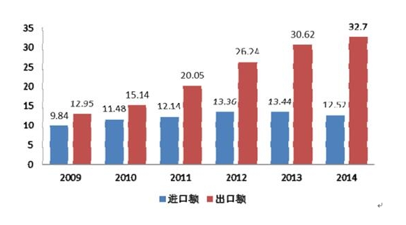 近年我国塑胶模具行业进出口额(单位:亿美元)