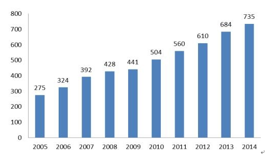根据中国模具工业协会数据,目前塑胶模具已占据国内模具总产值的 45%,成为最主要的一种模具产品。2005-2014 年,我国塑胶模具销售额由 275 亿元增长至 735 亿元,年复合增长率约 12%。