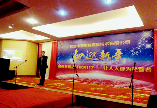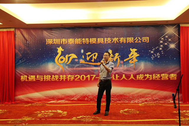 2016年12月31日深圳市泰能特模具有限公司在石岩长丰花园酒店举办了“机遇与挑战并存2017-人人成为经营者”主题年会。公司总经理席为旭先生做了主题演讲,对公司2016的工作业绩及存在问题作了全面回顾,并提出了2017年公司的发展规划和工作要求。