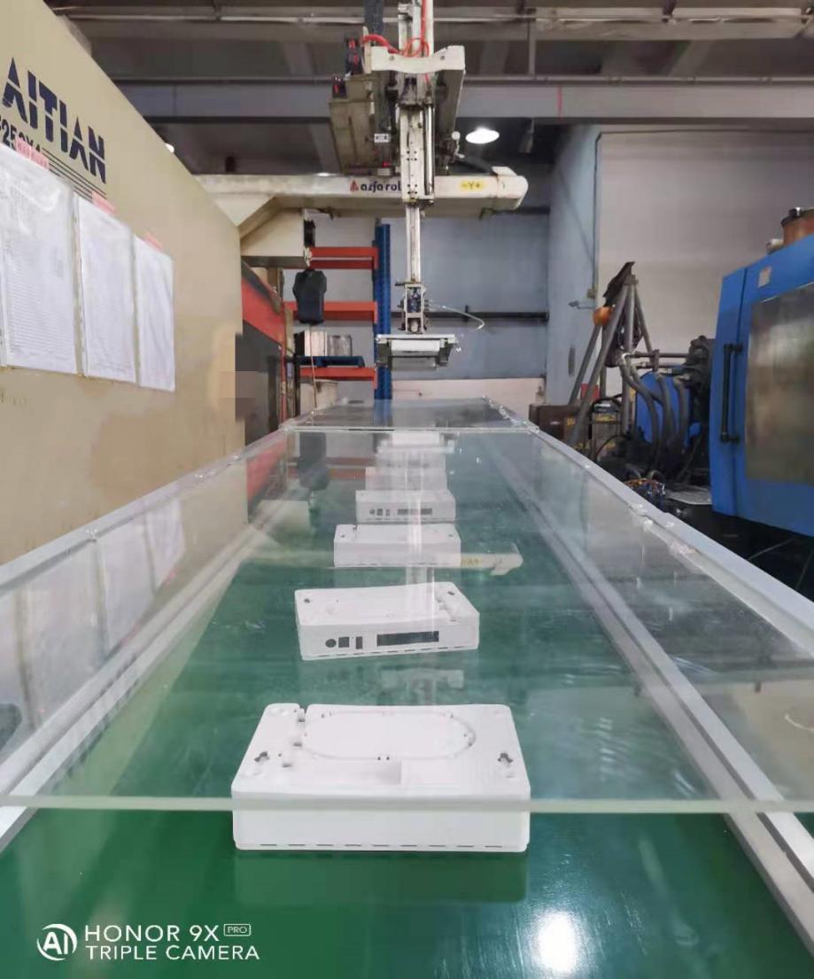 下盖产品四周批锋去除,不需要修件,2个产品通过设计合理的机械手治具,在生产中可以用机械手治具直接将产品抱住取下,成型周期控制到39秒以内;